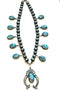 17" wearable length Kingman Naja necklace with 10 cabachons. Each cab measures approximately 1 1/2" x 1". Naja measures 3" x 2" with 1 x 1 1/2" Kingman turquoise cab. Native American made - Chimney Butte artist.