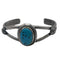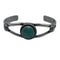 Cuff with 2 bar half round with 1 1/8" x 5/8" long oval shaped genuine turquoise stone with twist wire bezel and peyote button. Cuff measures 5" with 1 1/4" opening. Native American made.