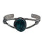 Cuff with 2 bar half round with 3/4" x 1/2" oval shaped genuine Sleeping Beauty inlay turquoise stone with wire bezel and peyote button in satin finish. Cuff measures 5" with 1 1/2" opening. Native American made.