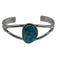 Cuff with 2 bar half round with 3/4" x 5/8" oval shaped genuine Pilot Mountain turquoise stone with wire bezel and peyote button in satin finish. Cuff measures 5" with 1 1/4" opening. Native American made.